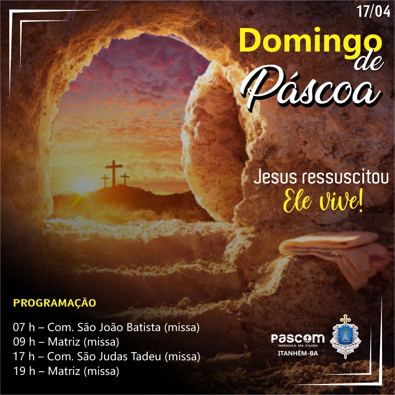 Aconteceu no dia 17 de abril, às 19h, a celebração do tradicional Domingo de Páscoa, feita pelo padre Vagner, com participação do diácono Emanuel e do seminarista Tharles. Páscoa vem da palavra hebraica “pessach“, que significa “passagem” e simboliza para toda comunidade a passagem de Jesus da morte para a vida, ou seja, sua ressureição, trazendo salvação para todos que creem nele (João 5:24). O coração contrito na fé depois de toda a tristeza vivida no Calvário pode finalmente se inundar com a alegria da vitória de Cristo sobre a morte e consequentemente, sobre o pecado, que ressuscitou para levar consigo a humanidade para o Reino do Céu.