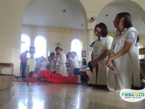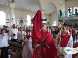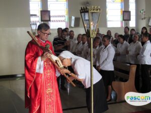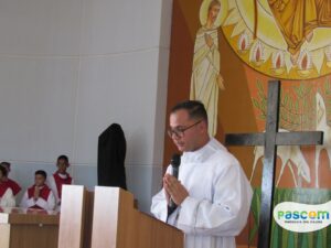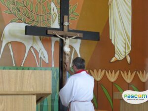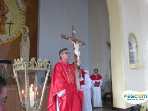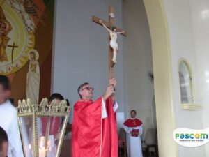 Sexta feira da Paixão do Senhor, dia em que a Igreja viveu a morte do seu Divino esposo, preso no madeiro em forma de cruz, Padre Vagner nos trouxe em sua homilia a riquíssima meditação do cardeal Raniero Cantalamessa o pregador da Casa Pontifícia, vimos no Santo Evangelho que aquele que domina céus e terra deixa-se ser amarrado, acorrentado, limitado em seus movimentos, onde o conduziram à presença do sumo sacerdote para ser interrogado, por nós Nosso Senhor sofreu todo tipo de torturas, empurrões, bofetadas, cusparadas foi castigado o corpo do Senhor, mas Ele se mantém diante do coração do Pai, nosso Senhor, amado nosso, tomou sobre si a sua cruz e arrastou o pesado madeiro pelas estreitas ruas de Jerusalém à caminho do Calvário(Gólgota), horas antes de ali mesmo crucificarem Jesus.