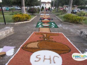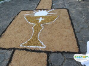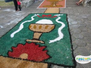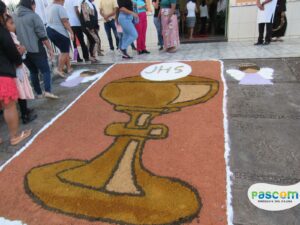Na manhã da quinta-feira, os jovens da Paróquia Nossa Senhora D’Ajuda, se reuniram às 8h da manhã para usar a criatividade para confecção dos tapetes para a procissão de Corpus Christi.