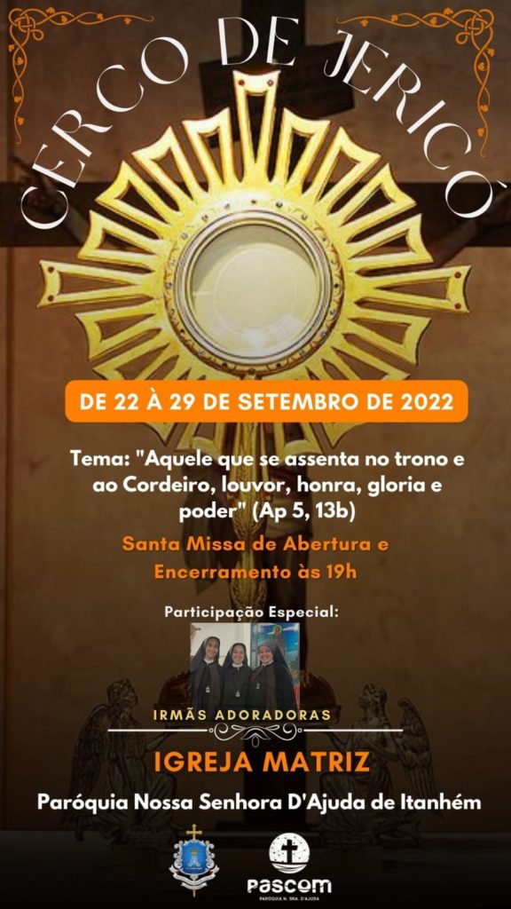 Na próxima quinta-feira, na Igreja Matriz, da Paróquia Nossa Senhora D’Ajuda em Itanhém, Bahia, dará início a mais um Cerco de Jericó. Com o tema: “Aquele que se assenta no trono e ao Cordeiro, louvor, honra, gloria e poder” (Ap, 5, 13b). Celebrada por Padre Vagner de Melo, a Santa Missa de abertura será às 19h do dia 22 de setembro. Teremos a participação das Irmãs Servas Adoradoras da Misericórdia.