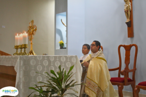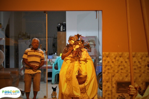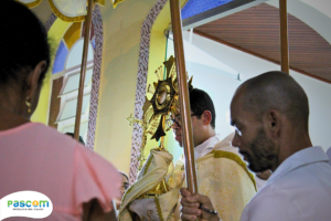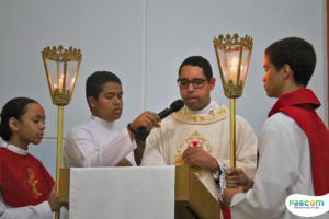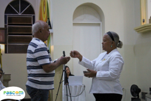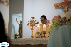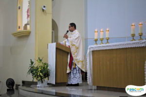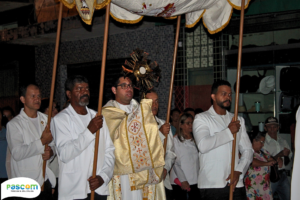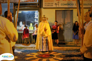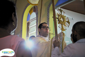 E na Igreja Matriz da Paróquia Nossa Senhora D’Ajuda a Santa Missa aconteceu às 17h e foi presidida pelo Padre Waldemir, administrador paroquial que em sua homilia nos falou da importância de celebrarmos Corpus Christi após o domingo da Santíssima Trindade, que é de fato enaltecer em nossa alma este sinal vivo do Cristo, o Cristo que quer ficar no meio de nós. O evangelho vem trazer Cristo que atualiza em si a aliança, e atualiza uma vez por todas. É Ele o Cordeiro que doa o seu sangue em sacrifício para nos resgatar para Deus, se dá como comida e bebida para salvação do mundo. Cristo vem ficar conosco na Santíssima Eucaristia, presença real do próprio Deus no meio de nós.
