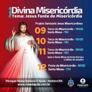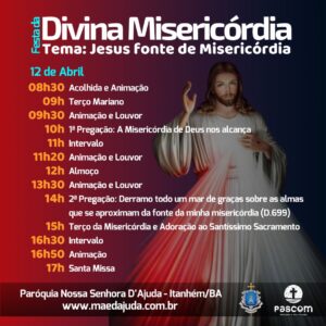 No dia 12 (domingo), foi o momento da grande Festa. Tudo começou pela manhã, seguindo durante todo o dia com muita oração, animação e pregação. A Festa da Divina Misericórdia contou com as presenças marcantes do casal Nilson e Flávia, bem como da Bruna Inoue e da Aurea Marinez, que levaram os fiéis a intensas experiências de oração e formação espiritual, tendo como base o Diário de Santa Faustina. O momento de Adoração Eucarística uniu todos os fiéis numa só voz, louvando a Jesus Misericordioso e clamando por bênçãos e graças.