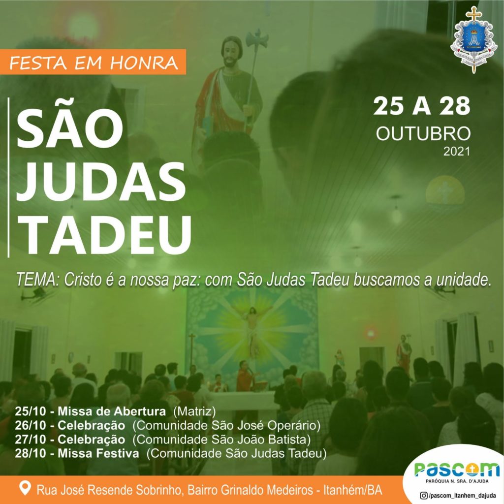 Nos dias 25 a 28 de outubro, acontece a Festa em Honra a São Judas Tadeu com o tema: “Cristo é a nossa paz: Com São Judas Tadeu buscamos a unidade”.