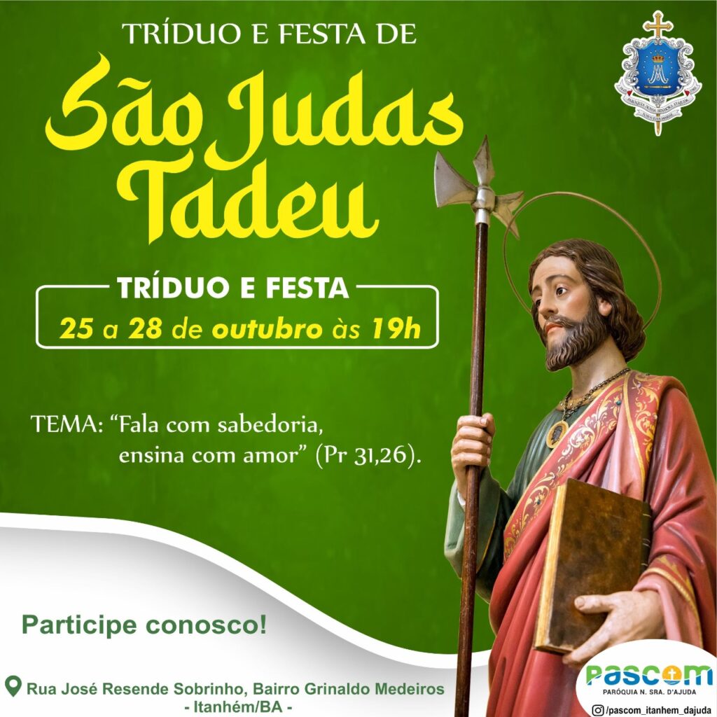 A comunidade São Judas Tadeu convida a todos para participar do Tríduo nos dias 25, 26 e 27 de outubro, e Festa que acontecerá no dia 28 de outubro. O tema desse ano será “Fala com sabedoria, ensina com amor” (Pr 31,26).