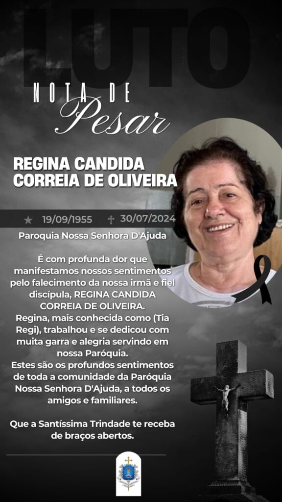 É com profunda dor que manifestamos nossos sentimentos pelo falecimento da nossa irmã e fiel discípula, REGINA CANDIDA CORREIA DE OLIVEIRA, atuava no cargo de coordenadora Paroquial.