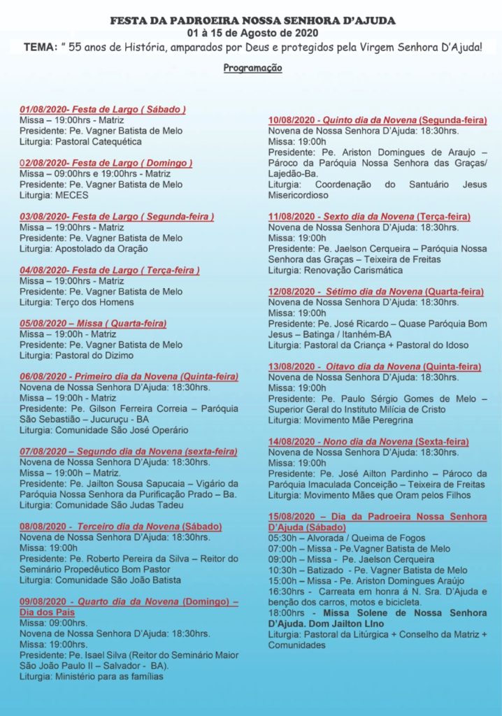 Programação da Festa da Padroeira Nossa Senhora D’Ajuda